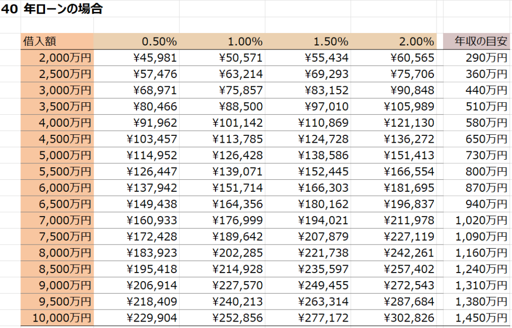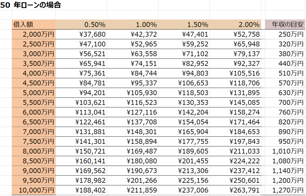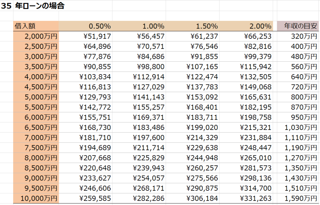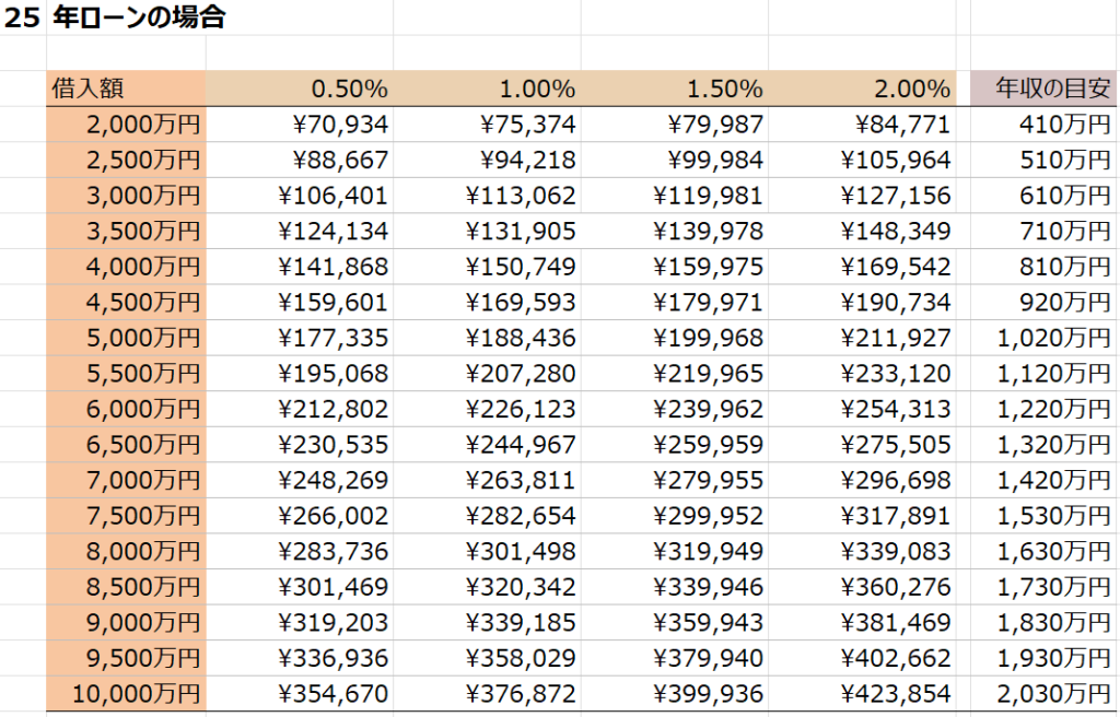 年収の目安は、額面の25%が返済になるように設定していますが、各家庭の家計簿や事情によって変わりますので、資金計画は別途してください。概ね、月の支払いが1万円増えるごとに、250万~350万程度家の予算が増えますが、家計の1万円は侮れません。